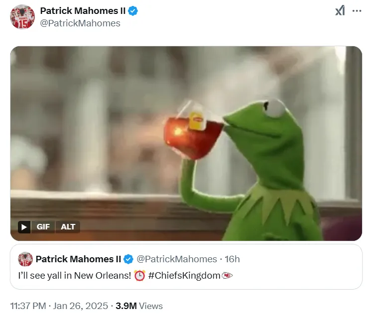The Chiefs quarterback didn’t forget about it either, but preferred to approach the situation with humor. In a message that the football community understood immediately, Mahomes posted a GIF of Kermit the Frog while celebrating the Chiefs’ ticket to the 2025 Super Bowl.