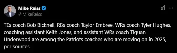 According to Mike Reiss, the Patriots will not retain three offensive coaches for next season. Bob Bicknell, who was in charge of the tight ends, is out, along with Taylor Embree, who had recently overseen the running backs. A notable change also includes Tyler Hughes, the wide receivers coach, signaling a deeper shift in that area.