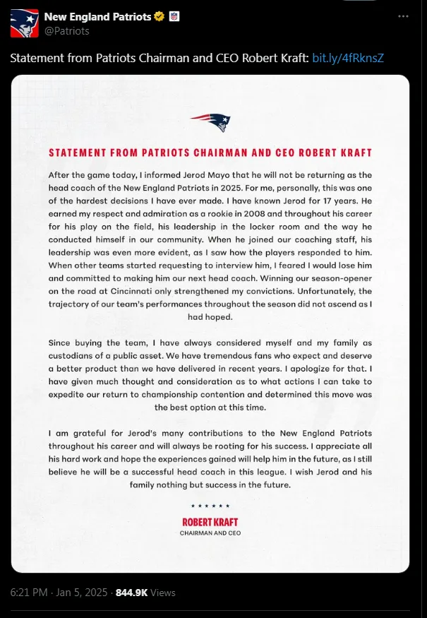 According to an official statement from Robert Kraft, Jerod Mayo will not return as the head coach for the upcoming season. He has officially been relieved of his position. The team’s Chairman and CEO admitted in his public statement that it was one of the toughest decisions he has ever had to make.
