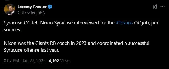 According to Jeremy Fowler’s report, the Texans interviewed Jeff Nixon, offensive coordinator for the Syracuse Orange. Nixon is no stranger to the league, having spent 2023 with the Giants as the running backs coach and 2022 with the Panthers.