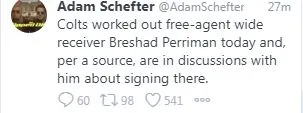 According to sources and Adam Schefter, the free agent wide receiver who recently worked out with the Colts was Breshad Perriman, likely to sign with the franchise.