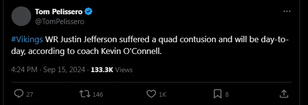Justin Jefferson delivered an incredible performance in Week 2’s game against the San Francisco 49ers, leading the Vikings to a 23-17 victory over one of the league’s favorites. However, Jefferson reportedly sustained a quad contusion, and he is considered day-to-day according to the update provided by head coach Kevin O’Connell during the press conference.