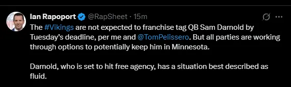 According to a joint report by Tom Pelissero and Ian Rapoport, the Vikings are not expected to franchise tag Sam Darnold. This doesn’t mean his future with the franchise is over, but the information suggests that the quarterback and the team are still discussing a possible new contract.