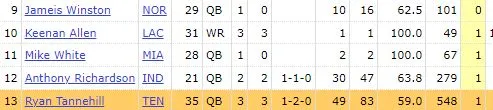 According to the stats on Pro Football Reference, the only starting quarterback to enter Week 4 with a single touchdown is Tennessee Titansâ Ryan Tannehill who after three weeks has 1 touchdown and 3 interceptions with a record of 1-2-0.