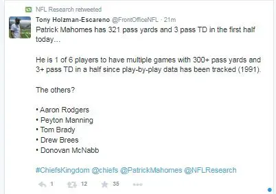 According to Tony Holzman-Escareno of the @FrontOfficeNFL, Patrick Mahomes joined an exclusive list of quarterbacks thanks to his performance during the first half against the Los Angeles Chargers. In that first half, he threw for 321 passing yards and 3 touchdowns, becoming 1 of 6 quarterbacks who have had multiple games with 300+ pass yards and 3+ passing TDs in a half.