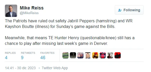According to injury reports compiled by Mike Reiss (@mikereiss), the team has ruled out two players for the Week 17 game: safety Jabrill Peppers (hamstring) and rookie wide receiver Kayshon Boutte (illness). Peppers has started 14 games this season and is a key member of the secondary, while Boutte has shown flashes of potential in his limited playing time.