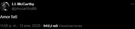 For the Vikings, one of the season’s toughest setbacks came early, with rookie quarterback McCarthy suffering a significant injury before the season even began. Now, as the team looks ahead to 2025, McCarthy took to his X account to share a two-word message following the game: “Amor fati.”