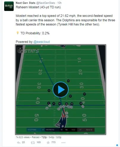 According to Next Gen Stats, Raheem Mostert not only scored a big touchdown during the game against the New England Patriots, but he also reached a top speed of 21.62 mph, establishing the second-fastest TD by a ball carrier in 2023. Tyreek Hill holds the first and third places on the list.