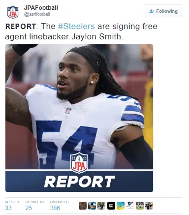 According to JPAFootball (@jasrifootball), the Pittsburgh Steelers are reportedly nearing a deal with free agent linebacker Jaylon Smith. Smith, who has played for the New Orleans Saints and Las Vegas Raiders this season, has been in the league since 2016.