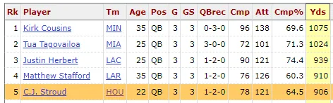 According to NFL stats and Pro Football Reference, the rookie who could reach 1,000 passing yards in Week 4 is CJ Stroud of the Houston Texans. After Week 3, he has 906 passing yards and 4 touchdowns.