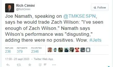 During an episode of The Michael Kay Show, Jetsâ legend Joe Namath said of the quarterback, âIâve seen enough of Zach Wilson.â But the worst thing was that Namath referred to Wilsonâs recent performance as âdisgusting.â