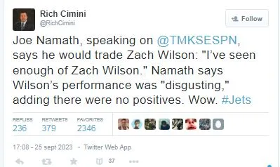 During an episode of The Michael Kay Show, Jets’ legend Joe Namath said of the quarterback, “I’ve seen enough of Zach Wilson.” But the worst thing was that Namath referred to Wilson’s recent performance as “disgusting.”
