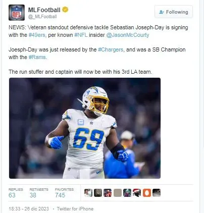 As reported by Jason McCourty (@jasonmccourty), the 49ers have signed defensive tackle Sebastian Joseph-Day. A six-year veteran with Super Bowl experience from his time with the Los Angeles Rams, Joseph-Day is expected to add depth and experience to the 49ersâ already-stout defensive line.
