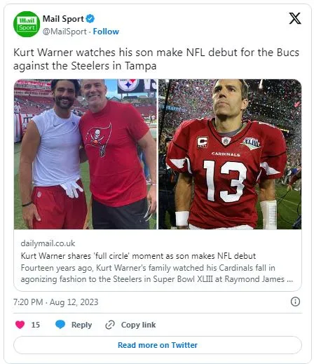 According to Mail Sport, former NFL player and Super Bowl champion Kurt Warner saw his son Kade Warner make his debut in a preseason game against the Pittsburgh Steelers. The Buccaneers lost 17-27. Kade is a wide receiver, and his father was a quarterback.