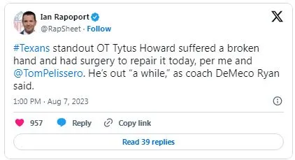 According to Ian Rapoport and Tom Pelissero, one of the Texans’ key offensive tackles, Tytus Howard, broke his hand during training camp on August 7. He is undergoing surgery to fix his hand and is expected to be out for a while.