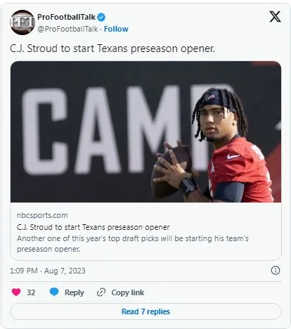 According to NBC Sports and other sources, the Houston Texans will start rookie quarterback C.J. Stroud in the preseason opener against the New England Patriots. Stroud was drafted by the Texans with the second overall pick in the 2023 NFL Draft. The game will take place on August 10, 7:00 PM (ET) at Gillete Stadium.