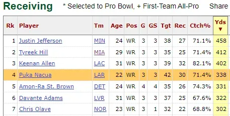 According to Pro Football Reference, the 22-year-old Ramsâ who is 4th in receiving yards entering Week 4 is rookie Puka Nacua with a total of 30 receptions and 338 receiving yards in three games as a starter.