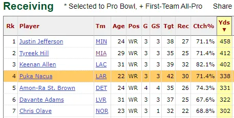 According to Pro Football Reference, the 22-year-old Ramsā who is 4th in receiving yards entering Week 4 is rookie Puka Nacua with a total of 30 receptions and 338 receiving yards in three games as a starter.