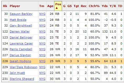 So far the Giants have used six wide receivers this season, with Hodgins being the only one capable of scoring a touchdown, but so far he has not reached 100 receiving yards.