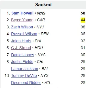The second is rookie Bryce Young with 44 sacks. This season, the Carolina Panthers are a disaster compared to previous years. No other quarterback has more than 50 sacks.
