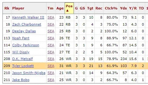 According to Pro Football Reference, the Seahawks wide receivers with most touchdowns entering Week 4 MNF is Tyler Lockett with a total of 2 touchdowns and 103 receiving yards.