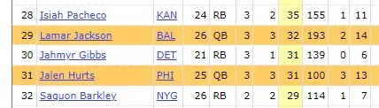 The other quarterbacks who are close to 30 rushing attempts are Justin Fields with 24 attempts and 109 yards, and New York Giants quarterback Daniel Jones with 24 attempts and 107 yards.