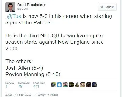 According to stats and Brett Brecheisen, Tua Tagovailoa has a perfect 5-0 record against Bill Belichick’s New England Patriots. This is an undefeated record that no other quarterback has been able to match so far. However, other quarterbacks do have five wins against Belichick, including Josh Allen (5-4) and Peyton Manning (5-10).