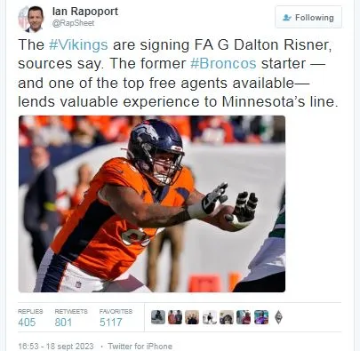 According to Ian Rapoport, the Minnesota Vikings signed Dalton Risner, who played with the Denver Broncos from 2019 to 2022 and was one of the key players on that franchise’s offensive line.