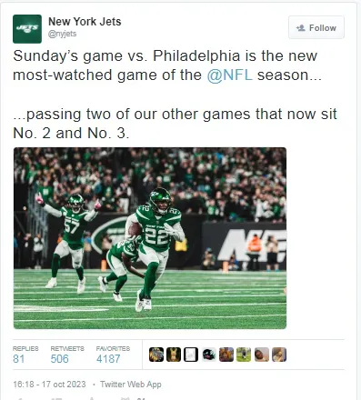 According to a tweet by the New York Jets, their Week 6 game against the Philadelphia Eagles is now the most-watched in the league, although viewer numbers were not revealed it is likely that what they claim is true since their source is the NFL.