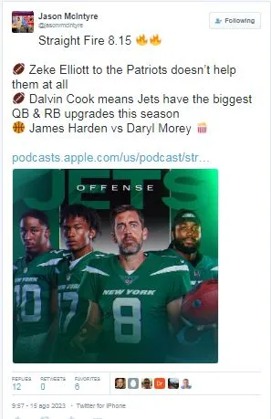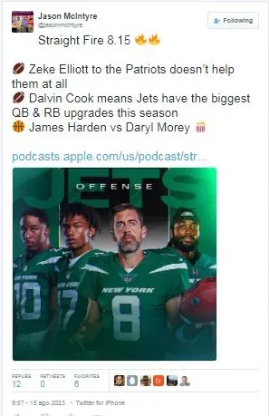 According to a recent podcast episode where Jason McIntyre gives his opinion on which NFL team got the biggest QB and RB upgrade of the season, he named the New York Jets as his best upgraded team after they added Aaron Rodgers and Dalvin Cook to their roster.