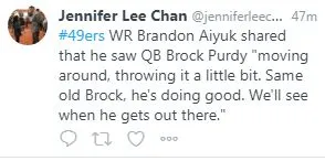 According to Jennifer Lee Chan, Brandon Aiyuk recently said that he saw Brock Purdy and added that he (Purdy) is “moving around, throwing it a little bit. Same old Brock, he’s doing good. We’ll see when he gets out there.”