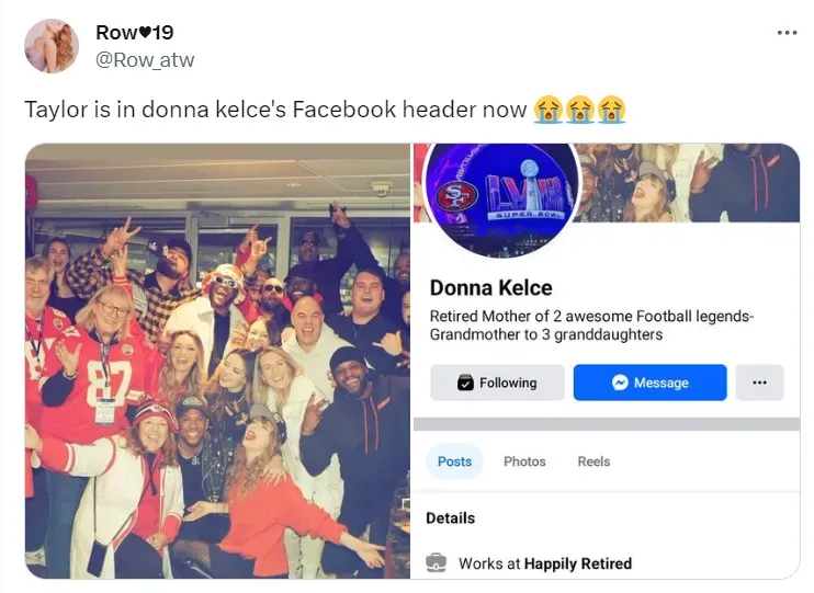 Donna Kelce even made the Swifties happy with a social media move, updating her Facebook header with a picture with Taylor and all those celebrating the Chiefsâ win over the Ravens in the 2023 AFC Championship Game.