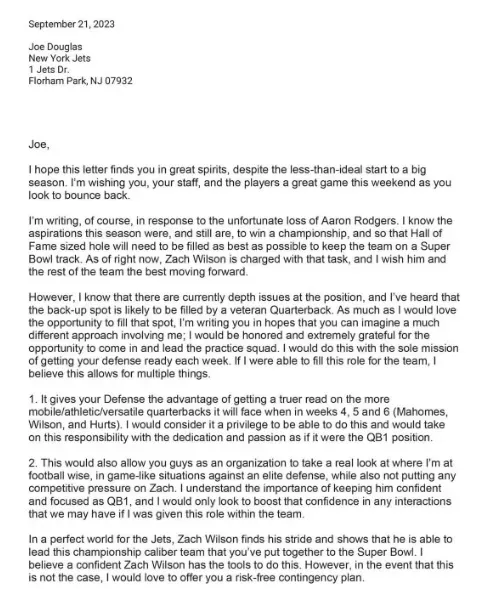 In the letter dated 10 days after Rodgers suffered his injury against the Bills, Kaepernick expressed his understanding of the team’s championship aspirations. He acknowledged that Zach Wilson was tasked with leading the team but requested to be signed to the practice squad, not to replace him in the lineup.