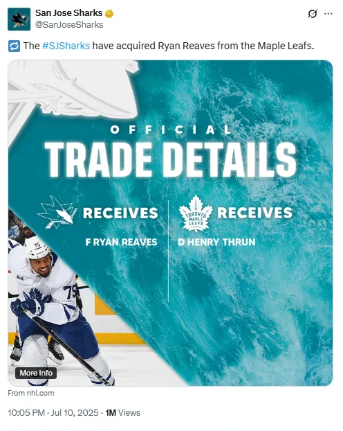 For the rebuilding Sharks, Reaves represents more than toughness — he’s a veteran voice in a young room and a potential mentor figure. With no expectation to contend in 2025, the franchise can offer Reaves consistent opportunities that were no longer available in Toronto.