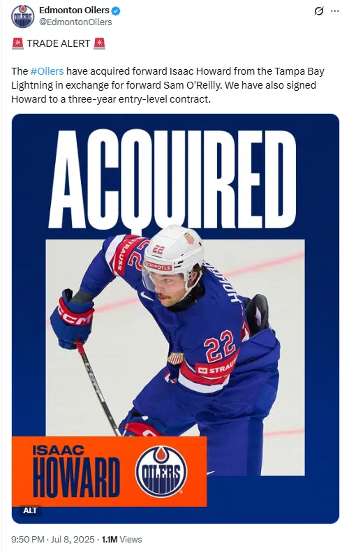 Connor McDavid‘s Edmonton Oilers continue their aggressive offseason, acquiring Hobey Baker Award winner Isaac Howard from the Tampa Bay Lightning in a high-profile trade. The move sends Edmonton’s 2024 first-round pick, Sam O’Reilly, the other way as both teams adjust their rosters for another Stanley Cup run.