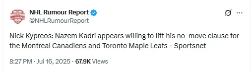 For now, the chatter remains speculative, but Kadri’s openness to waiving his no-move clause — even if limited — signals a shift in his outlook. As the offseason unfolds and teams reassess their needs, it would not be surprising to see serious conversations take place.