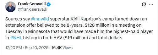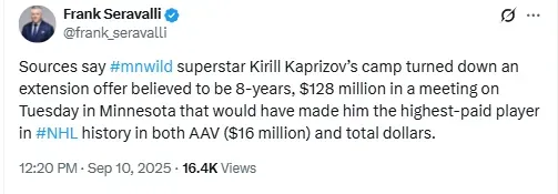For a player of Kaprizov’s caliber, the decision may not be purely financial. “Sources say #mnwild superstar Kirill Kaprizov’s camp turned down an extension offer believed to be 8-years, $128 million … that would have made him the highest-paid player in #NHL history in both AAV ($16 million) and total dollars,” Seravalli reported.