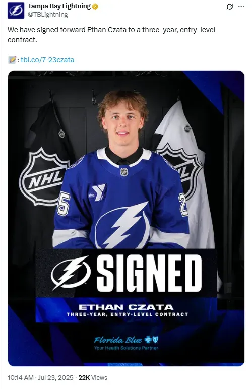 The Tampa Bay Lightning have taken a decisive step in securing their future down the middle by signing one of their most promising young forwards. Ethan Czata, fresh off a standout junior season and a gold medal performance on the international stage, has officially inked a three-year, entry-level contract with the NHL team.