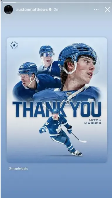 The post was widely shared by fans and teammates alike, but it was Auston Matthews’ repost to his Instagram Story—highlighting the words “Thank you”—that stood out. Though simple, the message was a meaningful nod from Toronto’s captain to the winger with whom he shared nearly a decade of highs and lows.