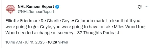 “Colorado made it clear that if you were going to get Coyle, you were going to have to take Miles Wood too; Wood needed a change of scenery,” revealed insider Elliotte Friedman on the 32 Thoughts podcast.