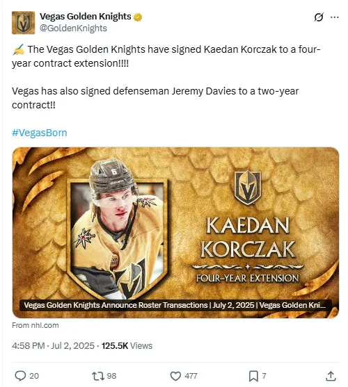 Following their blockbuster acquisition of Mitch Marner, the Vegas Golden Knights continue reshaping their roster by investing in their blue line. The NHL team announced a four-year, $13 million contract extension for defenseman Kaedan Korczak, locking in one of their most promising young players through the 2029â30 season. The deal carries a $3.25 million annual cap hit, beginning in 2026â27.