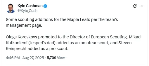 Reports confirmed that the Leafs hired Michael Kotkaniemi, a respected Finnish coach with more than two decades of experience, to oversee junior scouting in Finland. NHL insider Kyle Cushman also revealed that Olegs Koreskovs was promoted to Director of European Scouting, while Steven Reinprecht, a 2001 Stanley Cup winner with Colorado, has joined as a professional scout.