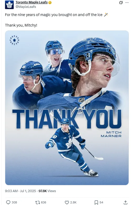 The Maple Leafs broke their silence shortly after the trade was announced, posting a heartfelt farewell on social media: “For the nine years of magic you brought on and off the ice. Thank you, Mitchy!”