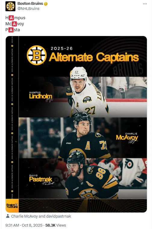 By appointing Pastrnak, McAvoy, and Lindholm as alternates, the Bruins maintain continuity and guidance without naming a new captain, reinforcing a team-first approach while navigating the early stages of a pivotal season.