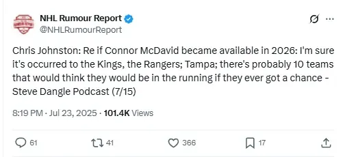 NHL insider Chris Johnston recently addressed the speculation about McDavid’s free agency on the Steve Dangle Podcast, saying: “If Connor McDavid became available in 2026, I’m sure it’s occurred to the Kings, the Rangers, Tampa; there’s probably 10 teams that would think they would be in the running if they ever got a chance.” This comment underscores how many top franchises would be ready to compete for McDavid, with the Kings frequently cited as a potential suitor.