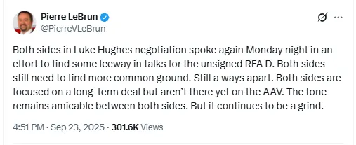 “Both sides in Luke Hughes negotiation spoke again Monday night in an effort to find some leeway in talks for the unsigned RFA D.” LeBrun shared on “X”. “Both sides still need to find more common ground. Still a ways apart. Both sides are focused on a long-term deal but aren’t there yet on the AAV. The tone remains amicable between both sides. But it continues to be a grind.”