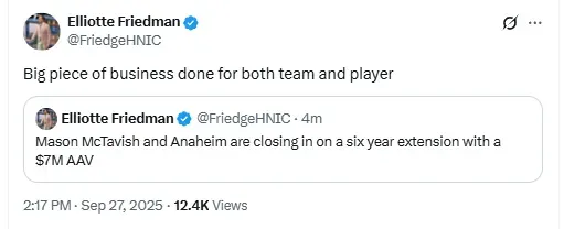 The agreement was first reported by Elliotte Friedman, who wrote on X: “Mason McTavish and Anaheim are closing in on a six year extension with a $7M AAV.” Shortly after, David Pagnotta confirmed the completed deal, adding: “Met in middle on term, McTavish nets his desired AAV. Good move for both sides.”