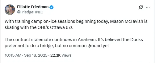 Negotiations reportedly revolve around salary expectations for a long-term deal. Despite having over $20 million in cap space, Anaheim has historically been conservative with restricted free agents, balancing fiscal responsibility with player retention. “With training camp on-ice sessions beginning today, Mason McTavish is skating with the OHL’s Ottawa 67s. The contract stalemate continues in Anaheim. It’s believed the Ducks prefer not to do a bridge, but no common ground yet,” reported Elliotte Friedman on X.