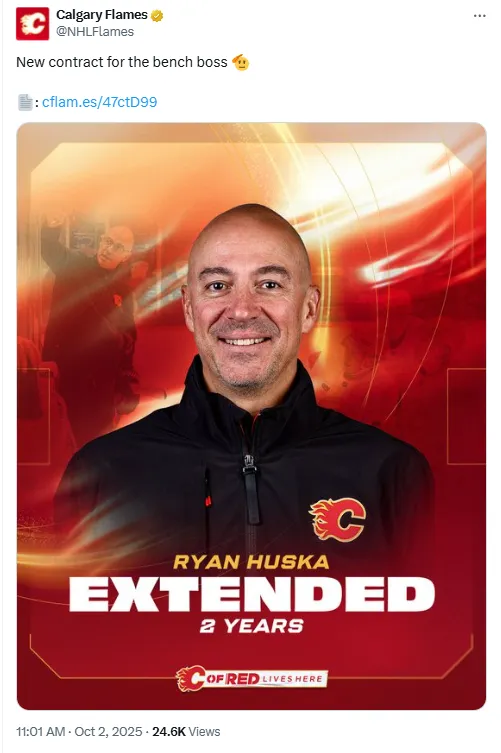 The Calgary Flames announced a two-year extension for head coach Ryan Huska, keeping him at the helm as the team prepares for the 2025-26 season. Huska, who became the 24th head coach in franchise history in June 2023, has guided the Flames to a 79-66-19 record in his first two seasons, narrowly missing a playoff berth in 2024-25.