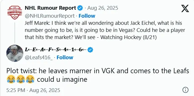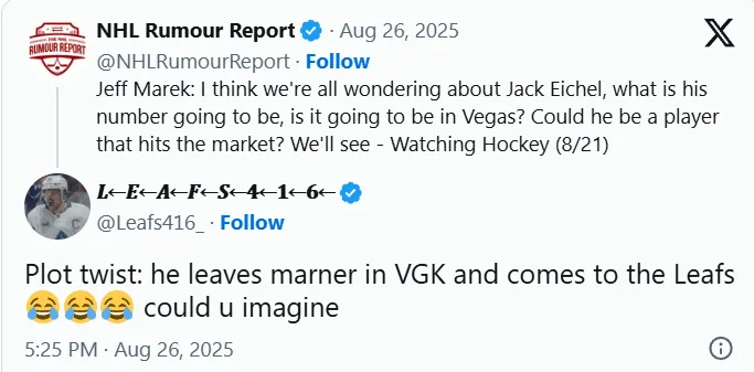 As the NHL approaches the 2026 free agency period, all eyes will be on Jack Eichel’s decision. Whether he stays with the Vegas Golden Knights or becomes an unexpected boost for the Maple Leafs, fan speculation continues to fuel debate and excitement over the upcoming season.